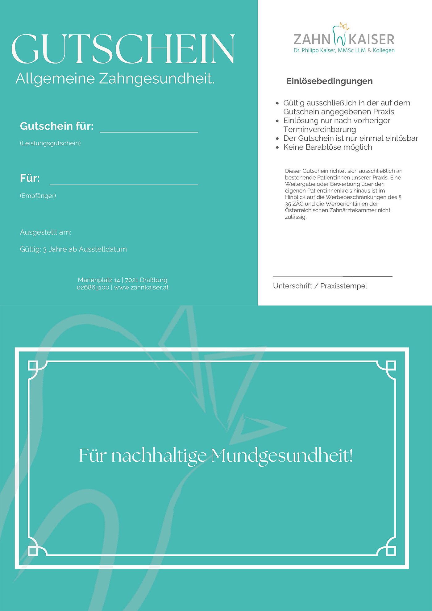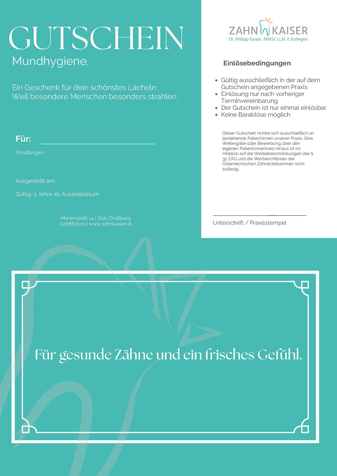 Ihren persönlich gestalteten „Gutschein Zahnarztpraxis Dr. Kaiser“ können Sie nach Ihrer Bestellung direkt in unserer Zahnarztpraxis in Draßburg abholen. Auf Wunsch ist auch ein Postversand Ihres Gutscheins möglich.