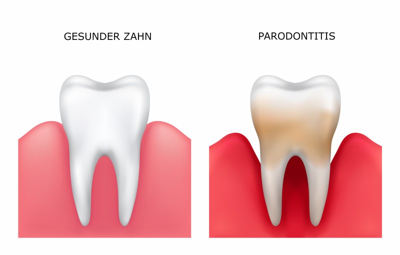 Parodontitis ist hingegen eine bakterielle Entzündung, die zunächst das Zahnfleisch betrifft. Es entsteht, wenn aus Zahnbelag Zahnstein entsteht. Bakterien können sich in diesem Festsetzen, und es werden Giftstoffe gebildet, welche ins Zahnfleisch gelangen. So entsteht eine Gingivitis, auch Zahnfleischentzündung genannt. Wird diese nicht behandelt, kann sie weiter in das Zahnfleisch vordringen, und eine Parodontitis entsteht. Diese kann zum Zahnfleischschwund und sogar zum Abbau von Knochen führen.