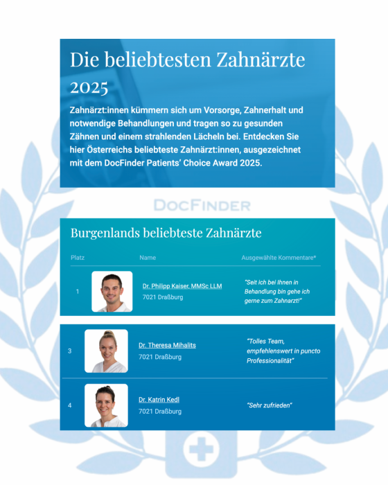 Der DocFinder Patients’ Choice Award 2025 ist für uns eine große Ehre und gleichzeitig Ansporn, unseren Weg konsequent weiterzugehen – mit Qualität, Vertrauen und persönlicher Betreuung.