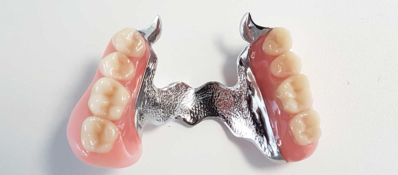 - Traditionelle Lösung mit sichtbaren Metallklammern, die die Prothese stabil halten.